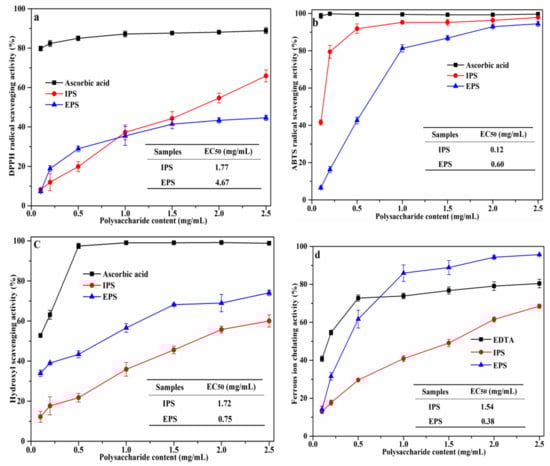 The chelating ability of IPS and EPS on ferrous ions also increased at higher concentrations (Figure 7d). EPS had the strongest chelating capacity (85.91%) at 1.0 mg/mL. Remarkably, this was higher than the positive control’s (73.90%) and IPS’s (40.84%) chelating abilities at same concentration. The EC50 of IPS and EPS were 1.54 mg/mL and 0.38 mg/mL, respectively. Thus, EPS showed a stronger chelating power on ferrous ions, which is probably due to the abundance of COO− and SO42- in EPS.