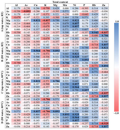 Each procedure (A–D) was associated with the total content. For procedure A (cold tap water extraction), there was a pair almost fully positively correlated (rs ≥ 0.9): Rb(total)/Rb(ext). Moreover, strong positive correlations (rs ≥ 0.7) were observed between Ni(total)/Ni(ext), Ni(total)/Mn(ext), Ni(total)/Mg(ext), Cu(total)/Mg(ext), and Zn(total)/Zn(ext). In turn, strong negative correlations (rs ≤ −0.7) were observed between As(total)/As(ext), K(total)/Mg(ext), and Zn(total)/Rb(ext). Other positive and negative correlations were not statistically significant (p < 0.05). For procedure B (cold deionized water extraction), there were two pairs almost fully positively correlated (rs ≥ 0.9): Cu(total)/Mg(ext) and Ni(total)/Ni(ext). Additionally, strong positive correlations (rs ≥ 0.7) were observed between P(total)/P(ext), Zn(total)/Zn(ext), Mg(total)/Mg(ext), Zn(total)/Cu(ext), Zn(total)/K(ext), Ni(total)/Mn(ext), and Mn(total)/Rb(ext). A strong negative correlation (rs ≤ −0.7) was observed only between K(total)/Mg(ext). Other positive and negative correlations were not statistically significant (p < 0.05). For procedure C (hot tap water extraction), there was a pair almost fully positively correlated (rs ≥ 0.9): Ni(total)/Ni(ext). Moreover, strong positive correlations (rs ≥ 0.7) were observed between P(total)/P(ext), Zn(total)/Zn(ext), Ni(total)/Mn(ext), Cu(total)/Mg(ext), and Mg(total)/Mg(ext). A strong negative correlation (rs ≤ −0.7) was observed only between Zn(total)/Rb(ext). Other positive and negative correlations were not statistically significant (p < 0.05). For procedure D (hot deionized water extraction), there were two pairs almost fully positively correlated (rs ≥ 0.9): Ni(total)/Ni(ext) and Ni(total)/Mn(ext). Additionally, strong positive correlations (rs ≥ 0.7) were observed between Mg(total)/Mg(ext), Mn(total)/Mn(ext), P(total)/P(ext), Zn(total)/Zn(ext), and Cu(total)/Mg(ext). There was also a pair almost fully negatively correlated (rs ≤ −0.9): Zn(total)/Rb(ext). Moreover, strong negative correlations (rs ≤ −0.7) were observed between K(total)/Mg(ext) and K(total)/Al(ext). Other positive and negative correlations were not statistically significant (p < 0.05).