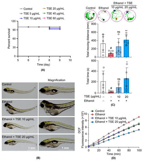 3.2. TSE Ameliorated Ethanol-Induced Behavior Changes and Oxidative Stress in Zebrafish