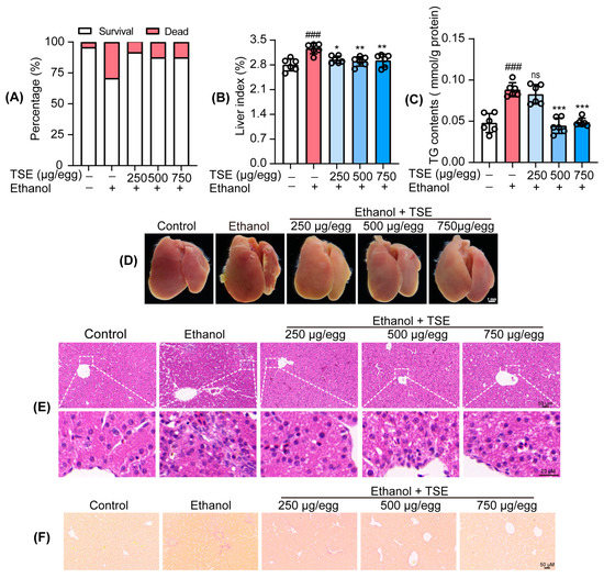 3.3. TSE Ameliorated Ethanol-Provoked Liver Dysfunction and Alleviated Liver Injury in Chicken Embryos