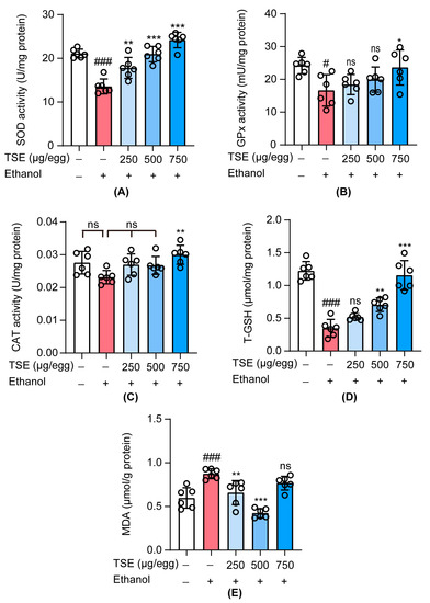 3.5. TSE Attenuated Oxidative Stress in Ethanol-Induced Chick Embryo Livers