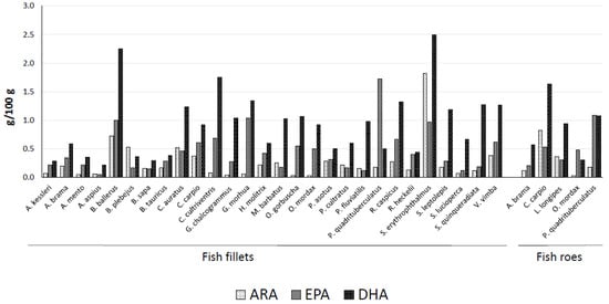 PUFAs ranged between 13.1 (A. aspius) and 49.7% (S. quinqueradiata) and were the most abundant FA group in both fillets and roes. In most cases, n-3 PUFA percentages were higher than n-6 ones. With some exceptions, DHA, EPA, and ARA were the most abundant PUFAs. The fillets of S. quinqueradiata, G. chalcogrammus, and Perca fluviatilis showed the highest amounts of DHA, with 34.4, 31.5, and 30.6% of total FAs, respectively, while in roes, DHA ranged from 10.5 (O. mordax) to 22.6% (R. caspicus) of total FAs. The highest percentages of EPA were found in the fillets of Pleuronectes quadrituberculatus and G. morhua and in the roes of P. quadrituberculatus (21.3, 17.9, and 18.8% of total FAs, respectively). Docosapentaenoic acid (DPA, 22:5n-3) was found in proportions ≥5.0% in three samples of fillets (C. carpio, S. quinqueradiata, and Perca fluviatilis) and three samples of roes (L. longipes, P. quadrituberculatus, and C. carpio). The fillets of A. aspius and Barbus tauricus showed the lowest percentages of EPA + DHA (8.8 and 8.9%), whereas S. quinqueradiata (39.4), Gadus chalcogrammus (39.8), and G. morhua (41.0%) showed the highest EPA + DHA proportions. Roe samples showed intermediate values for EPA + DHA percentages (from 16.6 in L. longipes to 37.3% in P. quadrituberculatus). DHA percentages were in most cases higher than EPA percentages.