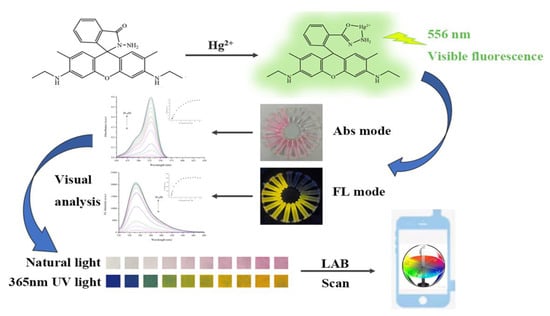 In this study, a rapid fluorescent and colorimetric dual-mode detection strategy for Hg2+ in seafoods was developed based on the cyclic binding of the organic fluorescent dye rhodamine 6G hydrazide (R6GH) to Hg2+. The luminescence properties of the fluorescent R6GH probe in different systems were investigated in detail. Based on the UV and fluorescence spectra, it was determined that the R6GH has good fluorescence intensity in acetonitrile and good selective recognition of Hg2+. Under optimal conditions, the R6GH fluorescent probe showed a good linear response to Hg2+ (R2 = 0.9888) in the range of 0–5 μM with a low detection limit of 2.5 × 10−2 μM (S/N = 3). A paper-based sensing strategy based on fluorescence and colorimetric analysis was developed for the visualization and semiquantitative analysis of Hg2+ in seafoods. The LAB values of the paper-based sensor impregnated with the R6GH probe solution showed good linearity (R2 = 0.9875) with Hg2+ concentration in the range of 0–50 μM, which means that the sensing paper can be combined with smart devices to provide reliable and efficient Hg2+ detection.