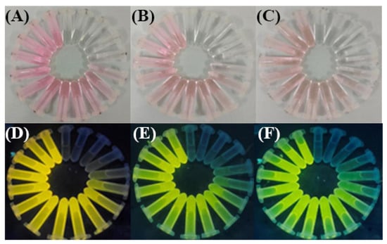 Color changes of Hg2+ induced R6GH probes in the three different solutions under natural light ((A): THF/H2O (v/v, 1:1); (B): ACN; (C): MeOH/H2O (v/v, 3:1)) and under 365 nm UV light ((D): THF/H2O (v/v, 1:1); (E): ACN; (F): MeOH/H2O (v/v, 3:1)).