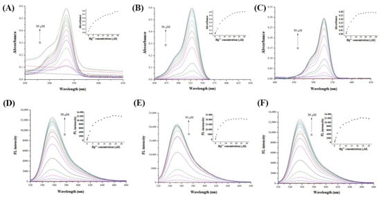 UV absorption spectra ((A) THF/H2O (v/v, 1:1); (B) ACN; (C) MeOH/H2O (v/v, 3:1)) and fluorescence spectra ((D) THF/H2O (v/v, 1:1); (E) ACN; (F) MeOH/H2O (v/v, 3:1)) of the R6GH probe (10 μM) in three tested solutions complexing with different concentrations of Hg2+ (0–30 μM). Inset: Relationship between R6GH absorbance or fluorescence intensity (Em: 556 nm) and Hg2+ concentrations.