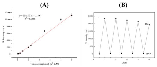 EDTA can coordinate with a variety of metal ions to form complexes and was used to examine the fluorescence reversibility of the R6GH probe []. The results showed that the fluorescence intensity of the R6GH–Hg2+ system to ACN sharply decreased after the addition of EDTA and even almost restored to the original state of the R6GH probe (Figure 4B). This indicated that EDTA could release Hg2+ from the R6GH–Hg2+ complex and turn off the fluorescence switch of the R6GH probe. When Hg2+ was added again, the fluorescence intensity of the solution recovered to be close to that of the R6GH probe solution when only Hg2+ was present, indicating that EDTA can cause the demetallization of the R6GH probe and regeneration of the spirolactam ring. After five cycles, the fluorescence of the R6GH probe solution did not significantly increase or decrease, indicating that the R6GH probe can release Hg2+ through competition with EDTA for reversible cycling of Hg2+ detection.