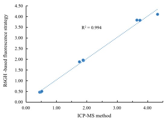 Correlation of Hg2+ detection results in real samples by R6GH-based fluorescence strategy and ICP-MS method.
