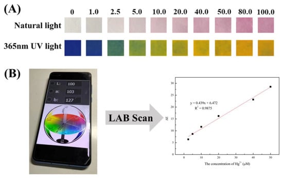 (A) Colors of immobilized paper-based sensors containing R6GH immersed in different concentrations of Hg2+ under natural and UV light. (B) Calibration curve of LAB ∆E value to Hg2+ concentration.