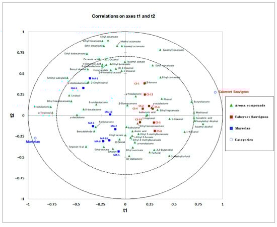 PCA exploratory data analysis was carried out and found that the volatile compounds were more influenced by the variety (Figure S1). Then, an overview of the differences in aroma compounds between Cabernet Sauvignon and Marselan was obtained by partial least squares–discriminant analysis (PLS-DA). The optimal number of factors for the calibration was selected based on the PRESS. As a result, a total of 16 factors of the PLS model were selected. As shown in Figure 1, a clear separation between the two varieties was obtained by a reliable PLS-DA model. As shown in Figure 1, the Cabernet Sauvignon wines were mainly located on the positive axis of the t1. The Marselan wines were mainly located on the negative axis of the t1. The distribution of the target metabolites can reflect the contribution between the two varieties of wines. The first and second components (t1 and t2), accounting for 32.7% of the total variance (total amount of variance explained in the x matrix [R2X] [cumulative] = 0.326, the total amount of variance explained in the y matrix [R2Y] = 0.932, and Q2 [cumulative] = 0.551). Isoamyl alcohol, 2-phenylethyl alcohol, isovaleric acid, methionol, γ-butyrolactone, and 1-nonanol revealed a high positive correlation with the first component (t1), whereas δ-octalactone, α-terpineol, methyl salicylate, linalool, ethyl hexadecanoate, γ-decalactone, δ-decalactone, and 4-terpineol revealed a strong negative correlation with t1. All Marselan wines are located on the negative axis of t1, and all Cabernet Sauvignon wines are located on the opposite axis of t1. Based on the variable influence on projection (VIP) score above 1, the predominant aroma compounds responsible for the discriminations were isoamyl alcohol, followed by methionol, isovaleric acid, δ-octalactone, 2-phenylethyl alcohol, α-terpineol, γ-butyrolactone, isoamyl hexanoate, ethyl hexadecanoate, linalool, γ-decalactone, 1-nonanol, 4-terpineol, ethyl cinnamate, phenol, methyl salicylate, 1-hexanol, ethyl nonanoate, and ethyl heptanoate. Among these compounds, the varietal aroma compounds, especially terpenoids, could be considered marker aroma compounds to distinguish Marselan wines from Cabernet Sauvignon, which could explain the distinct floral note in young Marselan wines.