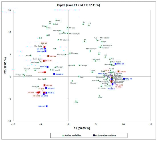 Partial least squares–discriminant analysis of Cabernet Sauvignon (CS) and Marselan (MA) dry red wines from five regions in China based on aroma compounds. Tringles represent the explanatory variables (X, aroma compounds). Circles represent the two studied categories (Cabernet Sauvignon and Marselan). Squares represent wine samples and sample names are in accordance with Table 1.