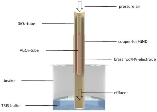For this study 300 mL of a fresh TRIS-buffer (0.5 mol/L), made out of TRIS (TRIS(hydroxymethyl)aminomethan, Trometamol, ≥99.8%, VWR International, Darmstadt, Germany) and TRIS HCl (TRIS(hydroxymethyl)aminomethan hydrochlorid, ≥99.0%, VWR) were used. Tb-PAW was prepared using 20 min activation by plasma at the Faculty of Engineering and Health (HAWK, University of Applied Science and Arts, Göttingen, Germany) using a PAL-reactor based on the principle of a double-insulated dielectric barrier discharge. The setup for the generation of Tb-PAW consists of an array of 10 plasma tubes. The single plasma tube consists of an outer silica tube (l = 300 mm, outer diameter 12 mm, wall thickness 1 mm, inner diameter 10 mm), wrapped with copper-foil as ground electrode (GND) and a centrally positioned Al2O3-tube (outer diameter 3 mm, inner diameter 1.6 mm) filled with a brass rod acting as high-voltage electrode (HV-electrode). The discharge gap (length 100 mm) is streamed with pressure air at a gas flow rate of 5 L min−1. The outer quartz tube protrudes approx. 5 cm into a beaker filled with the TRIS-buffer (Figure 1).