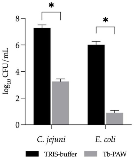 The microbiological tests were performed in accordance with ISO-10272-1 and ISO-16649-2. 9 mL of Tb-PAW and 9 mL of TRIS-buffer (control) were added to sterile test tubes. Then 1 mL of each bacterial suspension (approx. 107–108 CFU/mL) was added to the Tb-PAW or TRIS-buffer, vortexed, and incubated for 1 min at room temperature. This was followed by serial dilutions, and 100 µL of the appropriate dilution stage was spread in duplicate to Colic Brilliance™ E. coli/coliform selective agar (ColiC agar, Oxoid, for E. coli) or CCDA selective agar (CCDA, Oxoid, for C. jejuni). Agar plates were incubated as already described (Section 2.2).