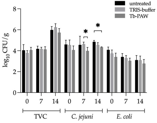 Spraying the Tb-PAW on the surface of chicken and duck thigh skin after inoculation with E. coli and C. jejuni and breast skin (without inoculation) followed by modified atmosphere packaging and storage over 14 days resulted in only a minor inhibitory effect on bacteria growth (Figure 3 and Figure 4). The Tb-PAW was able to achieve significant reductions of C. jejuni on the 7th and 14th day of storage after treatment of the chicken thigh skins. At day 7, a reduction was observed compared with the TRIS-buffer, whereas at day 14, the reduction only occurred between Tb-PAW and the untreated group. In contrast, E. coli and the TVC did not show improved reductions over the storage time after Tb-PAW treatment (Figure 3).