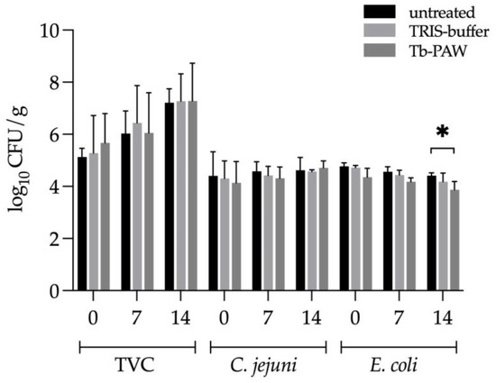 Reduction of the total viable count (TVC), Campylobacter (C.) jejuni and Escherichia (E.) coli on chicken carcasses either with or without Tb-PAW/TRIS-buffer treatment. Untreated and treated breasts (TVC) and thighs (C. jejuni and E. coli) with skin were stored in modified atmosphere packages (30% CO2, 70% N2) at 4 °C for 14 days. The samples from day 0 were analyzed on the packaging day, the others accordingly without re-treatment on days 7 and 14. Results represent the mean ± standard deviation. Significant differences are defined as * p ≤ 0.05. Tb-PAW = TRIS-buffered plasma-activated water.