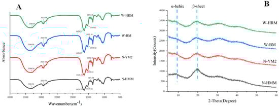 (A) Fourier transform infrared (FTIR) spectra and (B) X-ray diffraction (XRD) pattern of proso millet proteins. Abbreviations: N-HMM, non-waxy Huangmima; N-YM2, non-waxy Yumi No.2; W-HRM, waxy Hongruanmi; W-BM, waxy Baimi.