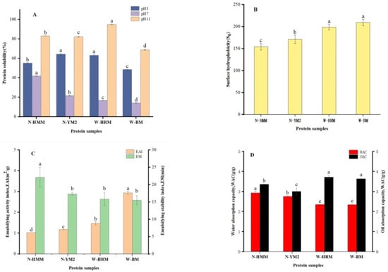 (A) Solubility of proso millet protein at various pH values (3.0, 7.0 and 11.0). (B) Surface hydrophobicity of proso millet protein at pH 7.0. (C) Emulsifying activity properties of proso millet protein at pH 7.0. (D) Water absorption capacity and oil absorption capacity of proso millet protein at pH 7.0. Values followed by a different letter in the same column are significantly different (p < 0.05). Abbreviations: N-HMM, non-waxy Huangmima; N-YM2, non-waxy Yumi No.2; W-HRM, waxy Hongruanmi; W-BM, waxy Baimi.