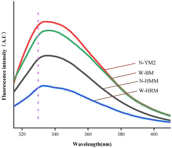 Fluorescence spectra of proso millet protein at pH 7.0. Abbreviations: N-HMM, non-waxy Huangmima; N-YM2, non-waxy Yumi No.2; W-HRM, waxy Hongruanmi; W-BM, waxy Baimi.