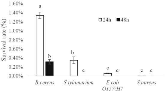 The survival rate of the four pathogenic bacteria (B. cereus, S. typhimurium, E. coli O157:H7, S. aureus) after being cocultured with Loigolactobacillus coryniformis NA-3 for 24 h and 48 h. Different lowercase letters mean significant differences (p < 0.05).