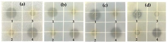 Antibacterial result of Loigolactobacillus coryniformis NA-3 supernatant evaluated by Oxford cup test. (a) B. cereus. (b) S. Typhimurium. (c) E. coli O157:H7. (d) S. aureus. 1: Original supernatant of L. coryniformis NA-3 (pH 4.0). 2: Supernatant of L. coryniformis NA-3 with pH adjusted to 7.0. 3: Original MRS broth (pH 6.0). 4: MRS broth with pH adjusted to 4.0.