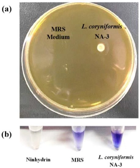 The production of BSH is one of the assessment standards for probiotics. Bile salts can be decomposed into amino acids and cholic acids by BSH. A white precipitate is produced after cholic acids react with cholesterol. Thus, BSH-producing probiotics are helpful for cholesterol removal. White sediment appeared when L. coryniformis NA-3 was grown on a medium supplemented with cholesterol (Figure 3a). This phenomenon means that a reaction between cholic acid and cholesterol occurred, suggesting the production of BSH. The color reaction of white sediment and ninhydrin was obviously bluish-violet and darker than ninhydrin solution and MRS broth (Figure 3b), indicating enzyme production. It has been demonstrated that elevated serum cholesterol levels increase the risk of atherosclerosis and coronary heart disease [33]. Cholesterol removal is always used as an evaluation criterion for probiotics. Bile salt metabolism and cholesterol metabolism are closely related. Deconjugated bile salts by BSH are able to co-precipitate cholesterol at low pH levels, which is an effective in vitro experiment to expose the role of the BSH activity of Latilactobacilli in relation to cholesterol lowering in culture liquid [33]. L. casei ASCC 292 has been reported to exhibit cholesterol removal activity [34]. For L. coryniformis NA-3, similar results to L. casei ASCC 292 were observed. In addition, the ninhydrin reaction is a method for determining the production of enzymes. Results involving white sediment and color reactions suggest the cholesterol removal ability and BSH production of L. coryniformis NA-3.