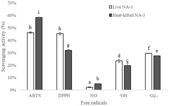 Antioxidant activity of live and heat-killed Loigolactobacillus coryniformis NA-3 evaluated by scavenging free radicals. Different lowercase letters mean significant differences (p < 0.05).