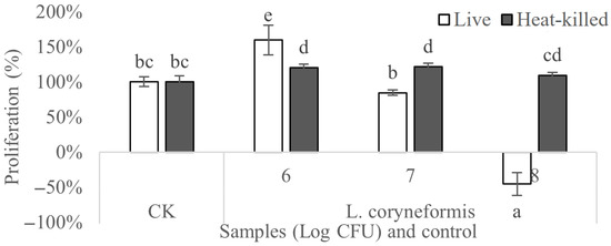 The anticancer activity of live and heat-killed Loigolactobacillus coryniformis NA-3 as evaluated using HT-29 cells. CK: Macrophages without treatment. Numbers 6, 7 and 8 on the abscissa: macrophages treated with different bacteria counts of Log CFU. Different lowercase letters mean significant differences (p < 0.05).