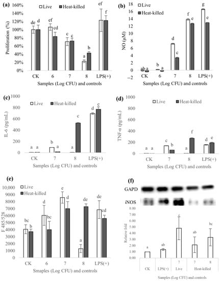Results of proliferation (a), NO (b), IL-6 (c), TNF-α (d), ROS (e), and iNOS expression (f) of RAW 264.7 macrophages treated with live and heat-killed Loigolactobacillus coryniformis NA-3. Different lowercase letters mean significant differences (p < 0.05). CK: macrophages without treatment. LPS: macrophages treated with LPS (1 μg/mL). Numbers 6, 7 and 8 on the abscissa: macrophages treated with different bacteria counts of Log CFU.