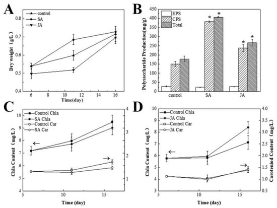 The effects of SA and JA on the biomass (A), polysaccharide production (B), and photosynthetic pigments (C,D) of N. flagelliforme. * p < 0.05, compared with the control group.