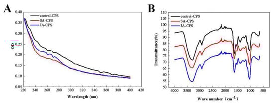 UV (A) and FT−IR (B) spectra of the control-CPS, SA-CPS, and JA-CPS.