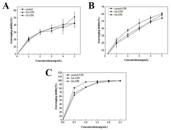The hydroxyl radical (·OH) is a free radical with strong oxidation ability, which easily oxidizes various organic and inorganic substances. It has a high oxidation efficiency and fast reaction rate and is an important reactive oxygen species that causes lipid peroxidation, nucleic acid breakage, and protein and polysaccharide decomposition in biological tissues. Compounds with hydroxyl radical scavenging ability can generally chelate iron ions and make them inactive in the Fenton reaction [36]. The scavenging abilities of the control-CPS, SA-CPS, and JA-CPS against the hydroxyl radical are shown in Figure 3B. The scavenging activity of the control CPS, SA-CPS, and JA-CPS was positively correlated with the polysaccharide concentration (<5 mg/mL). SA-CPS and JA-CPS exhibited a similar scavenging ability, which was slightly lower than that of the control-CPS.