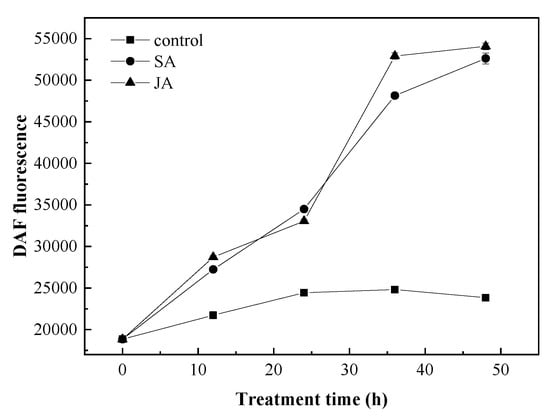 As a signaling molecule, NO production can be induced by a variety of plant hormones, such as cytokinin [42], auxin [43] and SA [44]. Furthermore, NO usually interacts with these hormones to regulate different physiological processes [45]. Here, the effects of 1 mg/L of SA and JA on the NO levels were investigated. As shown in Figure 4, the NO content in the cells of N. flagelliforme in the experimental group was significantly higher than in the control group.
