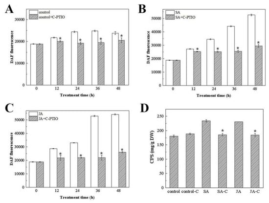 C-PTIO was added at a final concentration of 80 μM, and its effect on the NO content was assessed 48 h after treatment in the experimental group and the control group. As shown in Figure 5A–C, during the incubation period of 48 h under the three culture conditions, the NO content in the C-PTIO treatment group was significantly reduced compared with the control group without C-PTIO. These results indicat that the exogenous addition of C-PTIO to the culture medium effectively abrogated the induction of NO by SA and JA in N. flagelliforme.