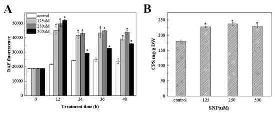 The effect of different SNP concentrations on the NO content (A) and the polysaccharide production (B) of N. flagelliforme. * p < 0.05, compared with the control group.