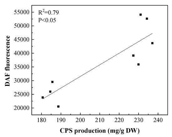 According to the analysis of the relationship between NO and CPS (Figure 7), CPS production was positively associated with the NO contents, and it is suggested that CPS production was correlated with the levels of metabolic level induced by the NO increased CPS accumulation. NO recently emerged as a key signaling molecule in plants. Studies have shown that NO acts as a signal molecule involved in the elicitor-induced defense responses of plants [19]. At the same time, the activation of the endogenous signaling pathways has been well documented to play key roles in regulating the accumulation of secondary metabolites in plants. NO has been well demonstrated to act as a signaling molecule that modifies cellular responses against different stressors in the corresponding signal transduction pathways [39]. Therefore, it can be speculated that SA and JA can be used as exogenous inducers to stimulate N. flagelliforme cells to produce NO through the corresponding metabolic pathways, and NO, in turn increases the production of CPS as a response signal.