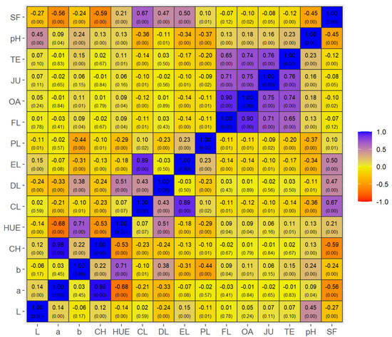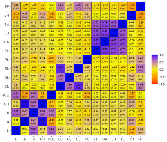 Pearson correlation (uppercase numbers) and significance (lowercase numbers; p-values) of Brangus heifers. Blue or purple colors means strong or medium positive correlations, while orange or yellow/browned colors means strong or medium negative correlations. Variables: SF = shear force; pH = ultimate pH (48 h post-mortem); TE = sensory tenderness; JU = juiciness; OA = overall acceptance; FL = liking of flavor; PL = purge loss; EL = evaporation loss; DL = drip loss; CL = total cooking losses; HUE = real color; CH = chromaticity; b * = yellowness; a * = redness; and L * = lightness.