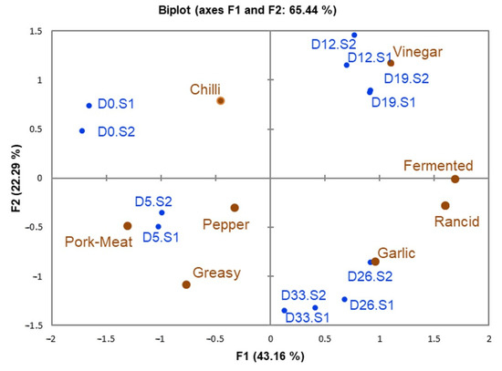 Figure 1 shows the evolution of the odor profile during the ripening of chorizo samples. In general, the GPA explained 65.44% of the variability, and the first GPA dimension (F1) explained 43.16% of the variability. The chorizo at zero and five days of ripening (D0 and D5, respectively) was on the negative side, while the chorizo samples at twelve, nineteen, twenty-six, and thirty-three days of ripening (D12, D19, D26, and D33, respectively) were on the positive side. The beginning of ripening, D0, was characterized by the pork meat odor and chili odor, then these odors decreased during ripening, although the first odor had a slight increase on the final day of ripening, showing similar results to those reported previously [31]. Vinegar, fermented, and rancid odors were detected; these odors were not expected until the final ripening. Nevertheless, some ingredients of chorizo, such as paprika, contain a diversity of organic acids, such as acetic acid, which could be related to the first two odors [10]. The intensity of the garlic odor increased from five days of ripening, but the judges found significant differences (p < 0.05) only between D0, with the least intensity, and the chorizo samples at the end of ripening, D26 and D33, with the highest intensity values. This result contrasted with Fernández-Fernandez et al. [4] and Stahnke et al. [31], who found that the garlic odor did not change over time. The garlic odor is mainly associated with sulfur compounds, and previous research has found that the amount of some sulfur compounds, such as allyl methyl sulfide, increased during ripening [48], so this likely explains the increase in the garlic odor.