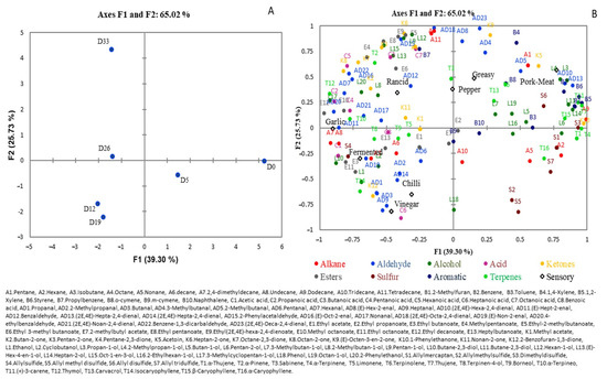 (A) Map of days of ripening, D0, D5, D12, D19, D26, and D33. (B) Evolution of the groups of volatile compounds and eight odors in chorizo samples using a Multifactor Analysis (MFA).