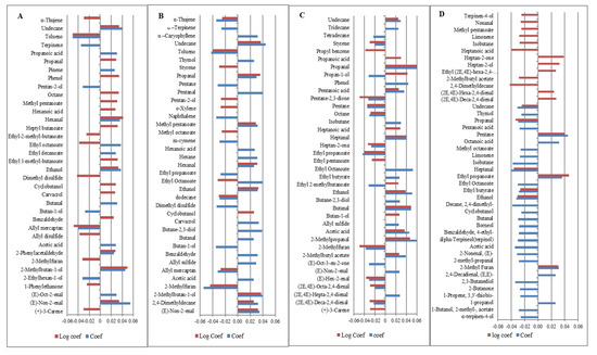 Standardized coefficients of volatile compounds used to predict odors: rancid (A), fermented (B), vinegar (C), and pork meat (D).