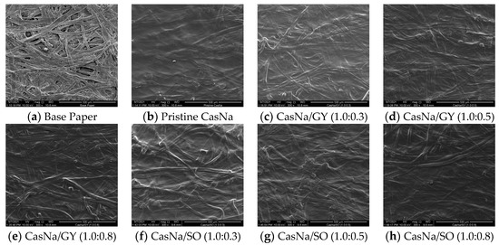 In the case of coated papers, a coating solution exists inside and on the top porous surface of the paper, which forms chemical and physical interactions between the coating solution and paper. The morphological structure of the coated papers affects their thermal and mechanical properties and air permeability. In this study, the effects of GY and SO on the morphological structure of CasNa/GY- and CasNa/SO-coated papers were observed using SEM, as shown in Figure 1. The base paper not coated with CasNa showed a porous structure composed of interwoven cellulose fiber (Figure 1a). The pores on the top surface of the pristine CasNa-coated paper were well covered by the pristine CasNa coating solution, although a portion of the fibers was still identified (Figure 1b). In addition, all CasNa/GY and CasNa/SO coating solutions penetrated the fibers well and covered the top surface of the paper without cracks (Figure 1c–h). This is related to the high compatibility and wettability between each coating solutions, with or without GY and SO, and the cellulose fiber, which may result in the penetration and adherence of all coating solutions to the base paper cellulose fibers [5,20]. GY and SO with low molecular weight diffuse into the CasNa matrix and facilitate mobility, in turn reducing the internal resistance of protein matrix. In addition, it is assumed that plasticized CasNa/GY and CasNa/SO coating layers are formed in the protein-plasticizer interactions with secondary force by disrupting the protein-protein interactions. These enhance the film forming process and flexibility by increasing the free volume and motion of the protein chains [21,22].