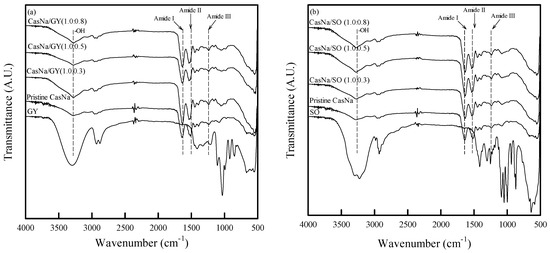 FTIR spectra of (a) CasNa/GY–coated papers and (b) CasNa/SO–coated papers.