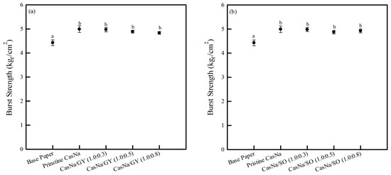 Burst strength of (a) CasNa/GY–coated papers and (b) CasNa/SO–coated papers. Lowercase letters (a,b) indicate statistically significant differences (p < 0.05).