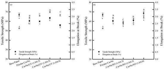 Tensile strength and elongation at break of (a) CasNa/GY–coated and (b) CasNa/SO–coated papers. Lowercase (a–d) and uppercase letters (A–D) indicate statistically significant differences of tensile strength and elongation at break, respectively (p < 0.05).