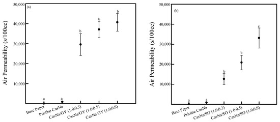 Air permeability of (a) CasNa/GY–coated papers and (b) CasNa/SO–coated papers. Lowercase letters (a–c) indicate statistically significant differences (p < 0.05).