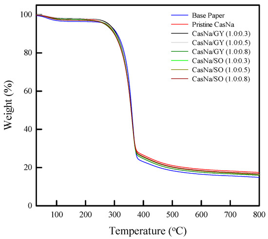 TGA curves of base paper, pristine CasNa–, CasNa/GY– and CasNa/SO–coated papers.