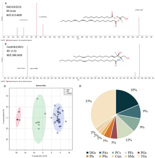 In the present study, the two representative matching images and compound structures from QI of DG (12:0/22:3) and Cer (d18:2/20:1) are shown in Figure 1A,B. PCA score plot of three grades of rice was presented in Figure 1C, a clear distinction among three grades could be seen basing on the lipids dataset. There were a total of 92 lipids identified in indica rice, including the 10 lipid classes DG, PA, PC, PE, PG, PI, PS, Cer, SM, and TG (Table S2). In Figure 1D, the % coverage of the pie plot is the percentage of each type of identified lipid number in the total identified lipids quantity of rice. Most identified lipids in rice were TGs and DGs, with proportions of 35% and 19% (Figure 1D), respectively, of total identified lipids.