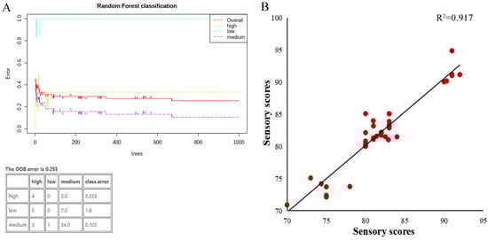 Grade-predicted model validation of rice. (A) RF results with lipids biomarkers. (B) Correlation study of sensory scores between actual and predicted ones by potential lipid biomarkers.