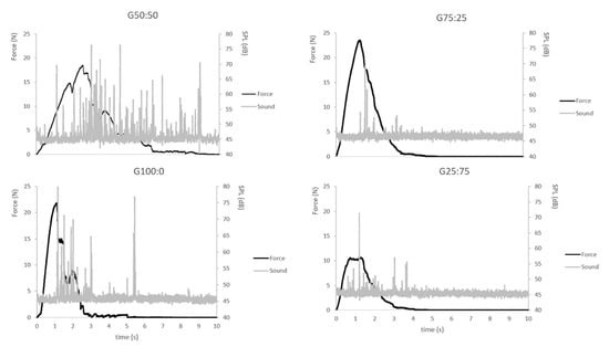 Figure 1 shows force-time and sound-time curves obtained in the texture and acoustic event analysis for each biscuit. The graph for G100:0 (as an example) shows a force increase region, starting from the first contact between the probe and the biscuit until the first major drop in the force (at around 1 s). Within this region, the compression force increased almost linearly with the displacement, while acoustically it was very quiet. This suggests that the biscuit undergoes deformation but no major structural damage. The acoustic signals recorded in this linear domain were not considered, as they resulted from surface contact between the biscuit and the probe. Then, the compression force became jagged and many acoustic events were recorded within a very short period. This is when the structural breakdown occurs, at the first crack. There was no further increase in the compression force after that break, but rises and falls in the measured force could be observed. These force reductions reflect the ongoing minor structural fracture in the biscuit. At around 2 s, a sharp drop in the compression force occurred, which corresponded to the major structural breakdown. After this significant event, the biscuit remained on the test platform and it took another push for the fractured biscuit to finally fall to the texturometer base. At this point, the compression force reached zero. The acoustic signals recorded after this major breakdown were not considered [24].