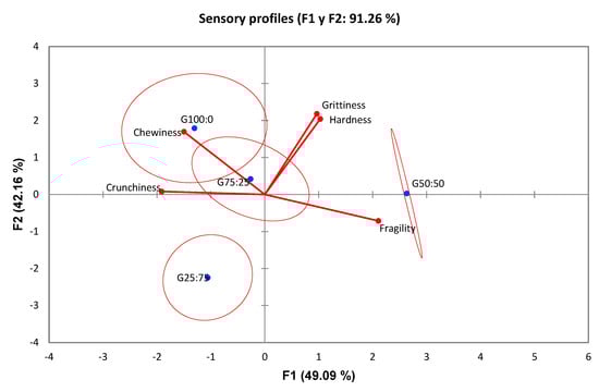 Table 7 presents the results of assessing the samples included in the PCA. The sample G100:0 differed from all the others; it showed the lowest fragility and the highest crunchiness and chewiness values. The G50:50 was the least crunchy and chewy and the most fragile. The G100:00 and G50:50 samples showed similar degrees of grittiness and hardness, greater than G75:25 and G25:75. In contrast, the sample G25:75 stood out from the others by showing the lowest grittiness and hardness. The sample G75:25 showed an intermediate sensory profile for grittiness, hardness, crunchiness, chewiness, and fragility, even though it had the crispiest texture. The fragility, crunchiness, and chewiness of G25:75 and G75:25 biscuits were very similar (no significant differences). Their fragility was lower than for G50:50 and greater than for G100:0 samples. The crunchiness and chewiness of G25:75 and G75:25 were lower than for the G100:00 sample and greater than for G50:50.