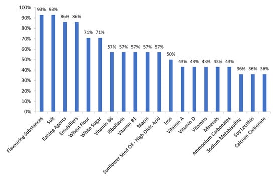 Among the top 20 ingredients found in the search (Figure 4), 93% of the biscuits contained flavourings and salt and 86%, raising agents and emulsifiers. Wheat flour and white sugar were present in 71% of the samples. Between 43% and 57% of the biscuits were supplemented with vitamin B6, riboflavin, vitamin B1, niacin, iron, vitamin A, vitamin D or other vitamins and minerals.