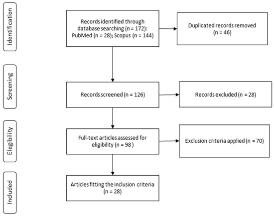 The study selection process is depicted in Figure 1. Following the described search strategy, 172 records were identified, of which 46 were excluded as duplicates. Finally, after applying the inclusion and exclusion criteria, 28 studies were found to be eligible for their inclusion in the present systematic review, considering no additional articles identified from the reference lists.